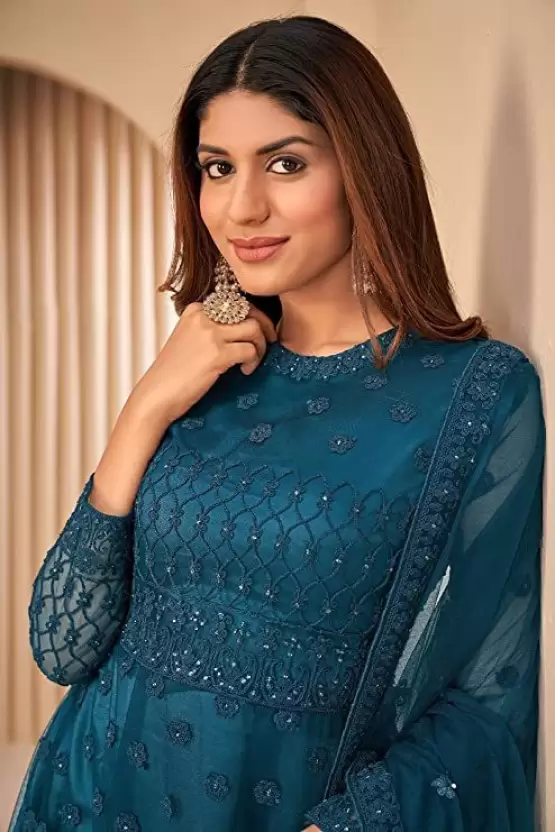 Embroidered Net Semi Stitched Anarkali Gown (Blue) Free Size