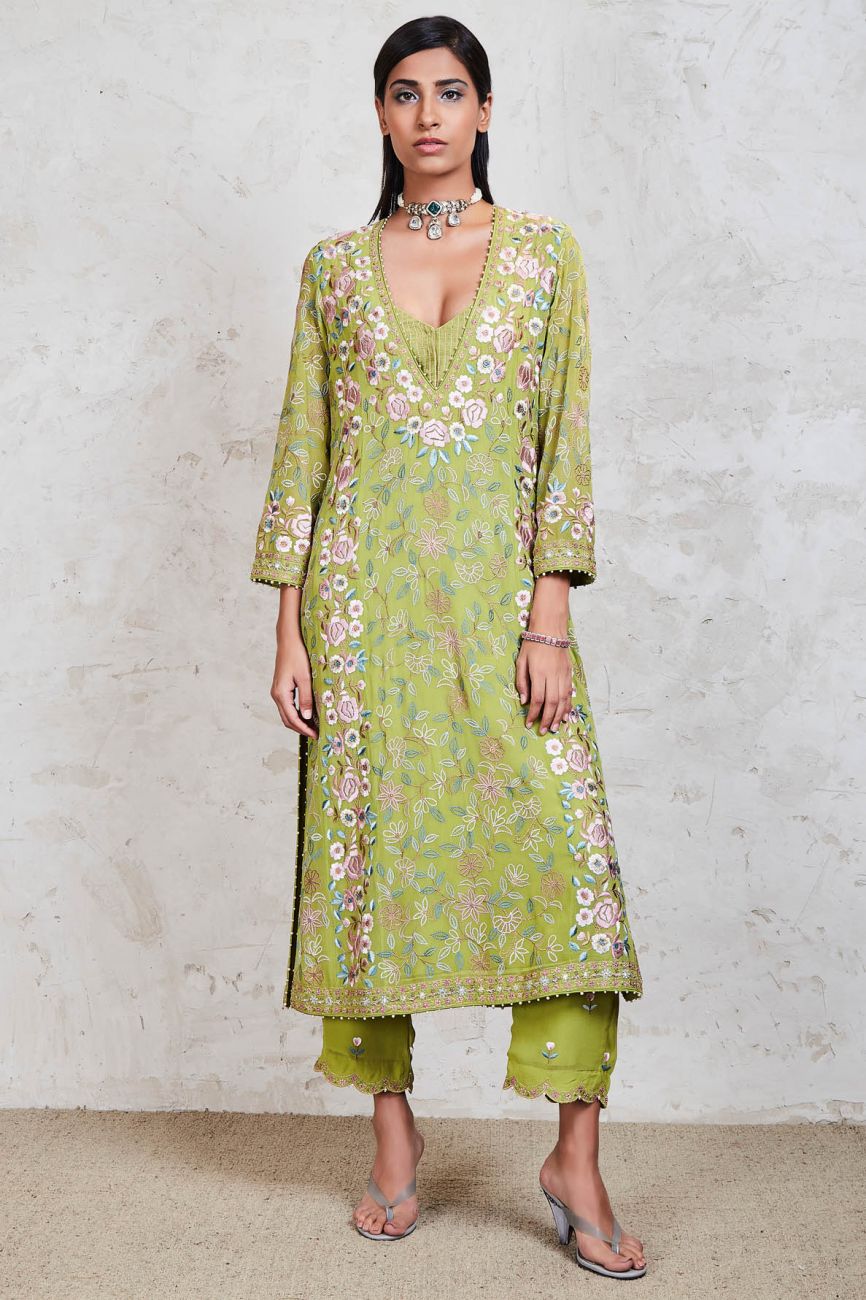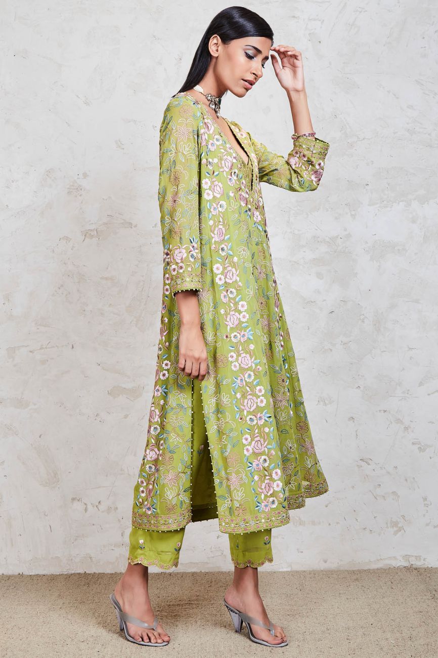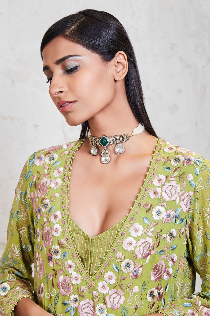 • An embroidered georgette dupatta scalloped at its edges and a raw silk bustier